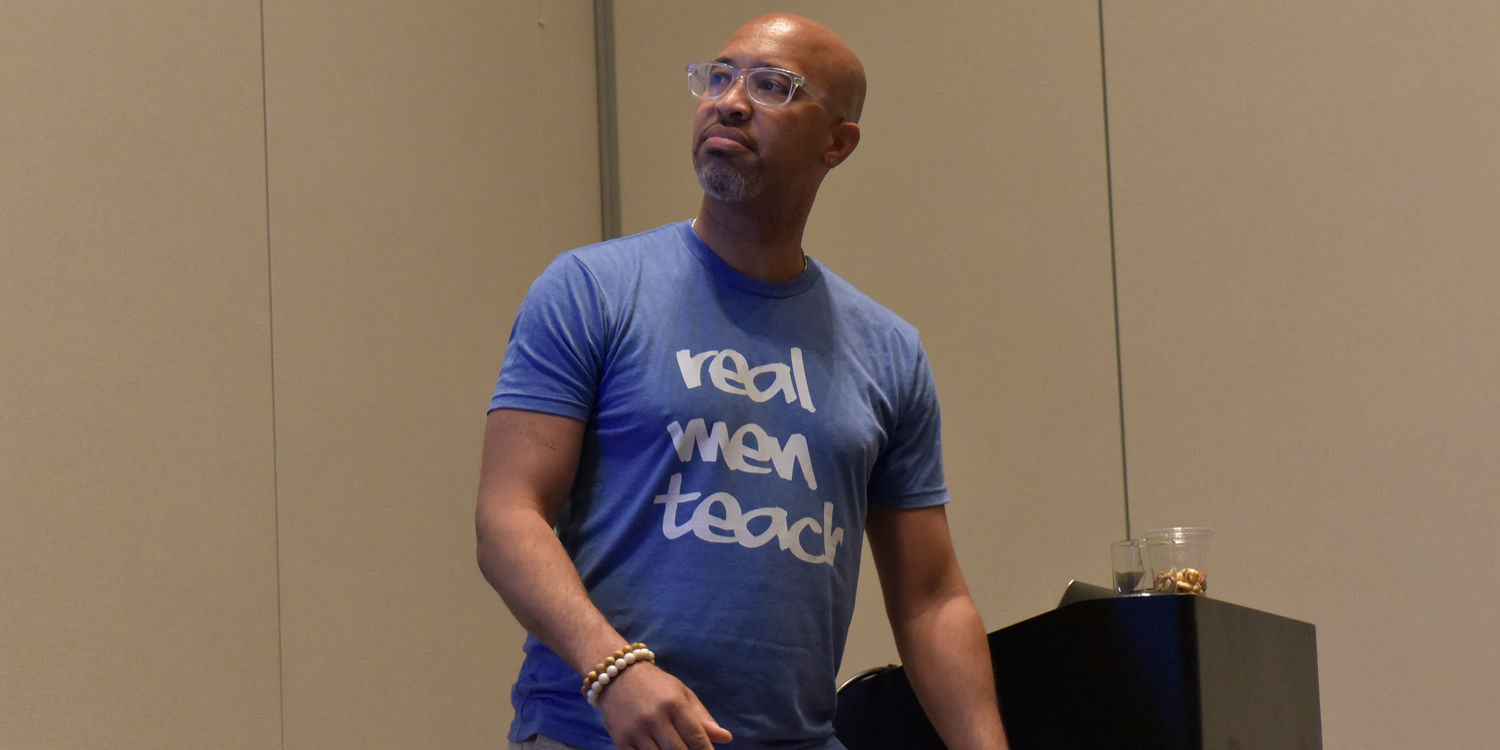 When Curtis Valentine of Real Men Teach asked this question of students at his session, several of them pictured their childhood teacher. According to Valentine, this is no surprise. We tend to project our histories into the future, he said. It’s important to unpack where the images in our minds come from. In other words, “in order to go forward we have to go back.”