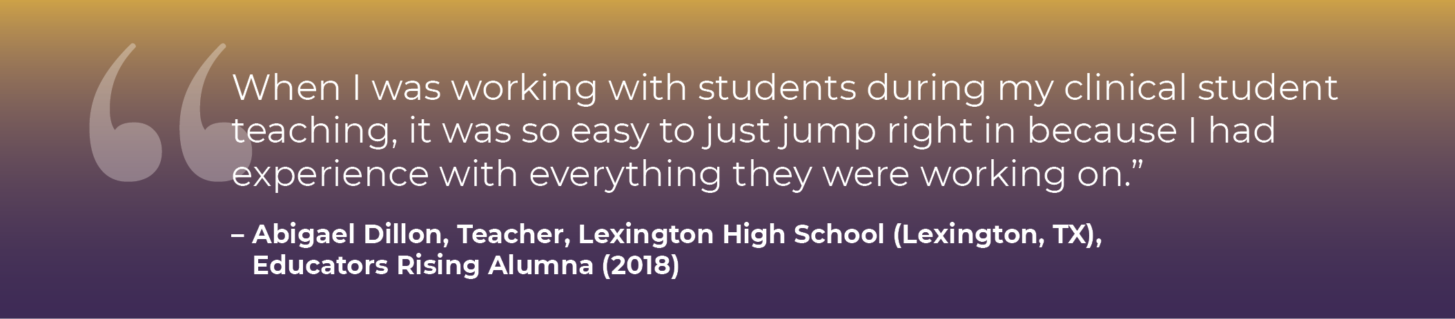 Educators Rising is cultivating a new generation of highly skilled educators by guiding young people on a path from high school through college and into their teaching careers. By working with aspiring educators who reflect the demographics of their communities and who are passionate about serving those communities through public education, Educators Rising is changing the face of teaching.