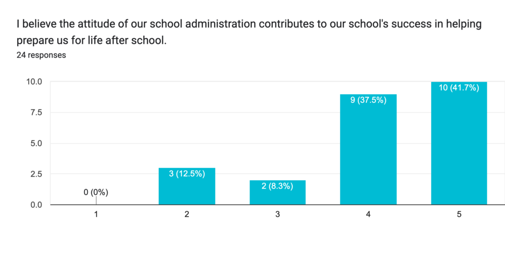 Educators Rising believes in amplifying student voice. As we can see from these responses, there is some strong consensus on the effect of teacher and student attitudes in contributing to the success of a given school day. Beliefs about school administration’s attitudes as it relates to post-graduation success was less uniform, and while all respondents did not equally make use of available school resources, there was a strong feeling that the availability of these resources makes a positive difference for students.