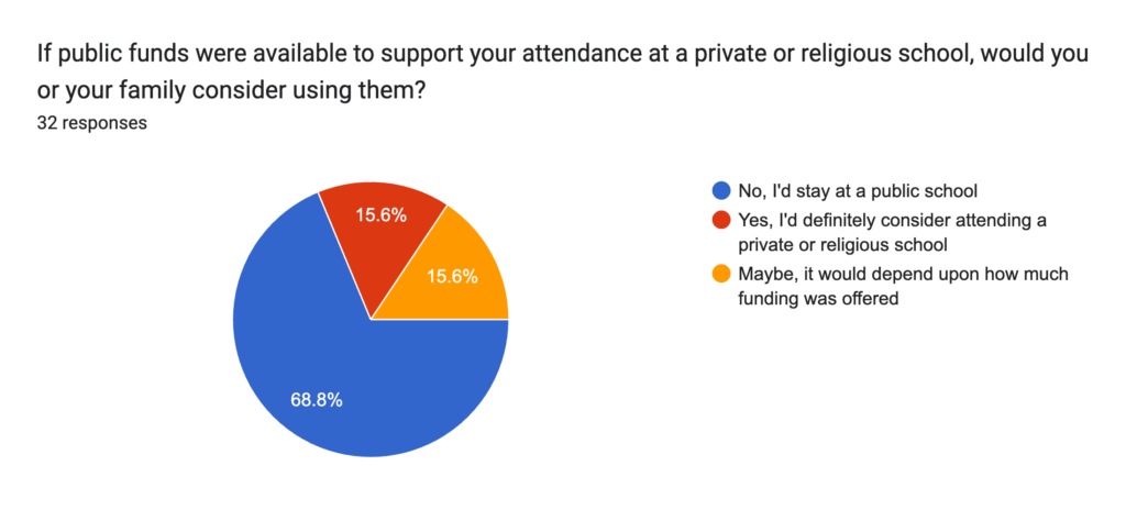 If public funds were available to support your attendance at a private or religious school, would you or your family consider using them?