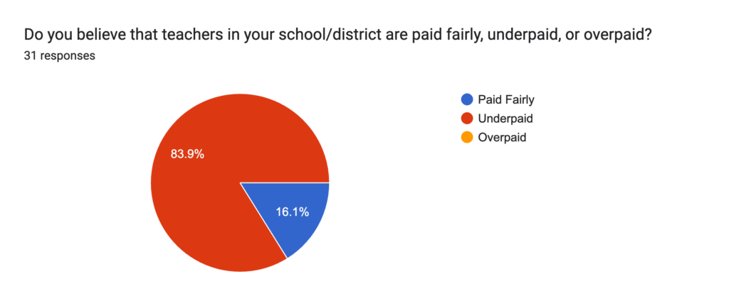 In our national poll, 1% of respondents believed that teacher pay was too high; 64% said it was too low, and 20% said it was just about right. In our student poll, 16.1% believed that teachers in their school or district are paid fairly, while 83.9% believed their teachers were underpaid.