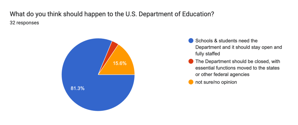 Our student poll revealed that 81% of students felt that schools and students need the Department and that it should stay open and fully staffed; 3.1% believe the department should be closed, with essential functions moved to the states or other federal agencies.